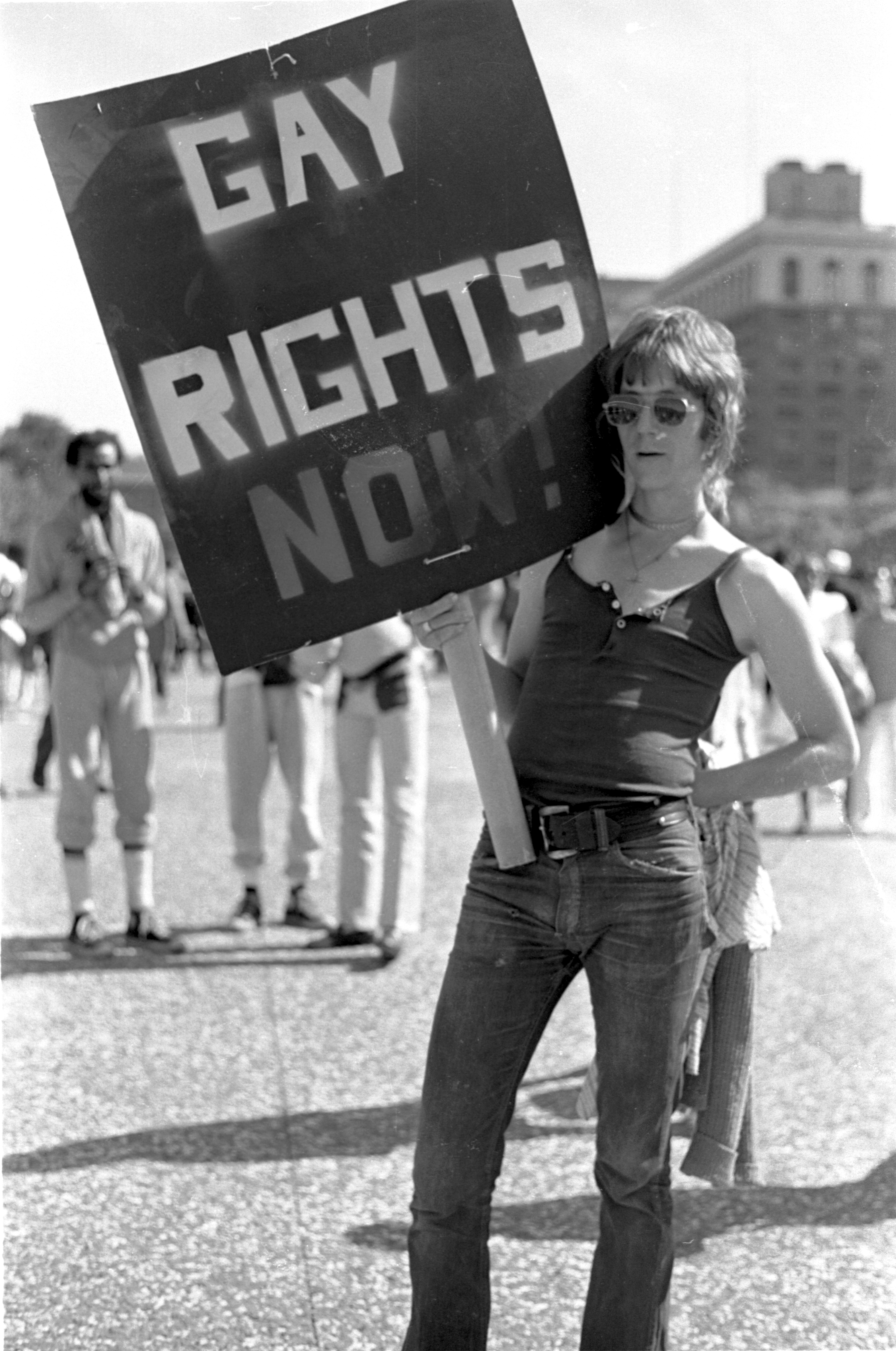 Pictured: Man identified by photographer as "Alex" with "Gay Rights Now" picket sign at Philadelphia Pride March at Independence Mall, 1973.